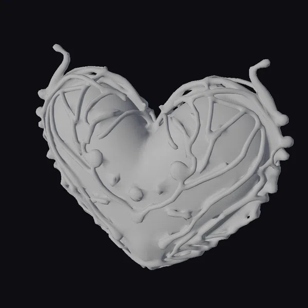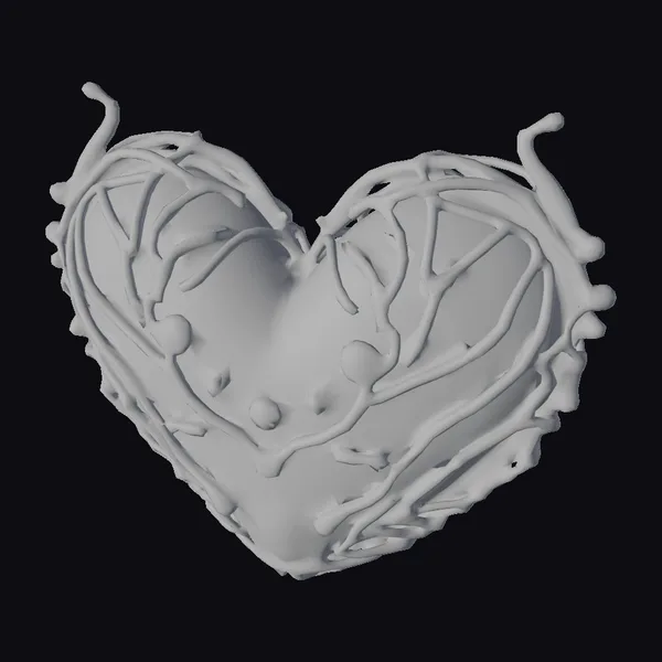 This stylized heart ornament features a pink heart wrapped in twisted, dark brown vines that appear to be organically grown around it. The heart itself has a soft, almost pearlescent sheen, reflecting light and adding depth to its appearance. Small, vibrant red hearts are scattered across its surface, creating a sense of movement and playfulness. The intricate details of the vines and the texture of the heart make it a captivating piece. Ideal for use in graphic design, animation projects, or as a decorative element in virtual environments, this model brings a touch of whimsy and romance to any scene.