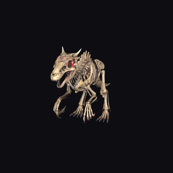 This eerie, stylized skeleton creature stands poised, its bony frame contorted in a menacing snarl. The model’s skeletal structure is meticulously detailed, with a long, pointed snout and sharp teeth bared in a fearsome growl. Two glowing red orbs serve as eyes, casting an otherworldly glow. The creature’s body is a mass of twisted bones, with long, curved claws on each limb, giving it a formidable, predatory stance. The overall effect is one of dark, foreboding horror, ideal for use in games, animations, or designs that require a chilling, supernatural element. Its unique, twisted form will add a memorable touch to any project.