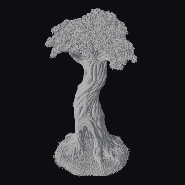 This stunning tree model features a thick, twisted trunk with visible roots that form a gateway-like structure at its base. The tree’s bark is detailed with deep grooves and ridges, showcasing its age and character. A lush canopy of bright green leaves adds a pop of color against the more subdued tones of the trunk and roots. The base of the tree is covered in moss, adding to the natural and mystical ambiance. The model is highly detailed, making it suitable for close-up shots or as part of a larger fantasy landscape. Ideal for use in games, animations, virtual reality experiences, or architectural visualizations.