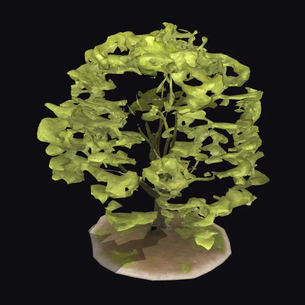 Perched on a rugged beige base, this twisted tree rises with a sturdy trunk that splits into numerous branches. The leaves are a bright, electric green and have a wavy, irregular shape, giving the tree a stylized and fantastical appearance. The lighting highlights the texture of the leaves and the roughness of the tree’s base, creating a sense of depth. This model would be perfect for adding a touch of fantasy to games, animations, or architectural visualizations.