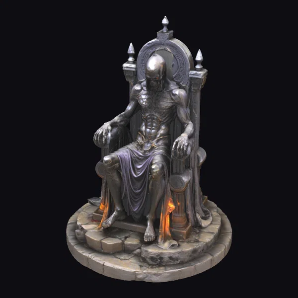 Rendered in exquisite detail, the undead summoner sits imposingly on a throne of cracked stone, its skeletal frame draped in tattered purple cloth. The figure’s bald head and gaunt face are tilted downward, as if lost in dark thought. Flames flicker at the base of the throne, casting eerie shadows on the surrounding stone floor. This dark fantasy reinterpretation exudes an aura of mystique and foreboding, making it a compelling addition to any 3D environment, from games and animations to virtual reality experiences and architectural visualizations.
