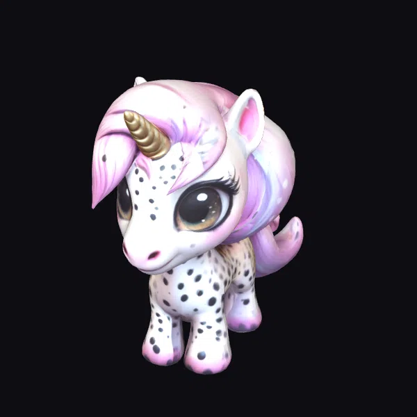 In a pose that’s both endearing and dynamic, this unicorn-leopard hybrid stands out with its unique blend of characteristics. The model’s white base is speckled with black spots, reminiscent of a leopard’s coat, while its mane and tail flow with a soft pink hue. A gold horn protrudes from its forehead, adding a touch of magic. The large, expressive eyes are detailed with eyelashes, enhancing the chibi-style charm. Textures are smooth, with subtle shading that gives the model a 3D appearance. Lighting accentuates the horn and eyes, creating a captivating effect. This model is perfect for projects requiring a whimsical, fantastical element, such as animations, games, or 3D printing. Its cute and kawaii style makes it a versatile asset for various creative ventures.