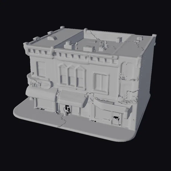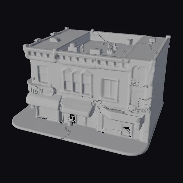 Perched on a gray sidewalk, this meticulously crafted urban city block boasts a dynamic mix of architectural styles and textures. The Osei’s Flavors deli stands out with its bright red awning, while a gas station and various shops line the street level. Apartments rise above, adorned with a kaleidoscope of graffiti that adds a layer of urban grit. The model includes a range of details, from the deli’s signage to the gas station’s pumps, inviting users to explore every nook. Ideal for projects requiring a realistic urban setting, such as games, architectural visualizations, or film and animation scenes.