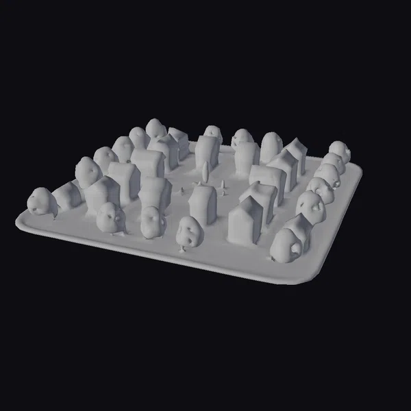 Perched dynamically on a rectangular base, this stylized urban community layout showcases a meticulously planned neighborhood. The scene is dominated by white houses featuring bright red roofs, arranged in a pattern that suggests thoughtful urban planning. Lush green trees are scattered throughout, adding a touch of nature to the otherwise man-made environment. The roads, painted in a darker shade to represent asphalt, intersect at the center, facilitating easy navigation through the community. The entire setup is bathed in a soft, diffused light, highlighting the textures of the buildings and foliage. This model is perfect for projects requiring a suburban feel, such as architectural presentations, urban planning visualizations, or even video game environments. Its detailed yet stylized appearance makes it versatile for various applications, from professional designs to creative projects.