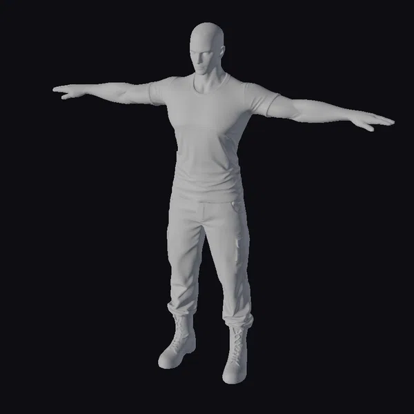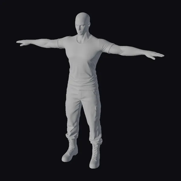 This 3D model presents a highly detailed and realistic portrayal of a US Army soldier. The soldier stands with his arms outstretched to the sides, showcasing his military attire. His uniform consists of a green t-shirt with ‘U.S. ARMY’ printed across the chest, matching green cargo pants, and sturdy brown boots. The model boasts a shaved head, adding to his military appearance. The facial expression is stern, capturing a moment of serious contemplation. The level of detail in the model makes it suitable for various applications, including games, 3D printing, virtual reality (VR), augmented reality (AR), and animation. Designers and developers can integrate this model into projects requiring a realistic military character, enhancing visual fidelity and narrative depth.