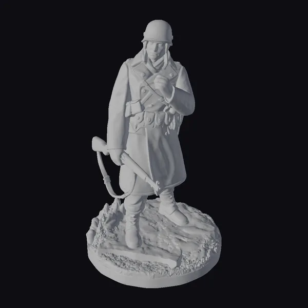 Standing tall on a stark black base, this meticulously detailed US soldier is captured in a moment of quiet vigilance. His face is set in a determined expression, framed by the olive green of his helmet and the high collar of his uniform. The tan coat, adorned with buttons and epaulets, is worn over his uniform, with a utility belt cinched at his waist, holding various military tools. A rifle, complete with a bayonet and sling, hangs from his left hand, while his right hand grips the rifle’s stock, ready for action. The model showcases a high level of detail, from the texture of the coat to the equipment strapped around his body. This model is perfect for projects requiring a realistic historical military presence, such as games, animations, or historical reconstructions.