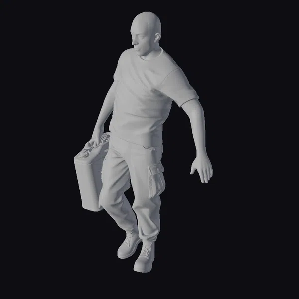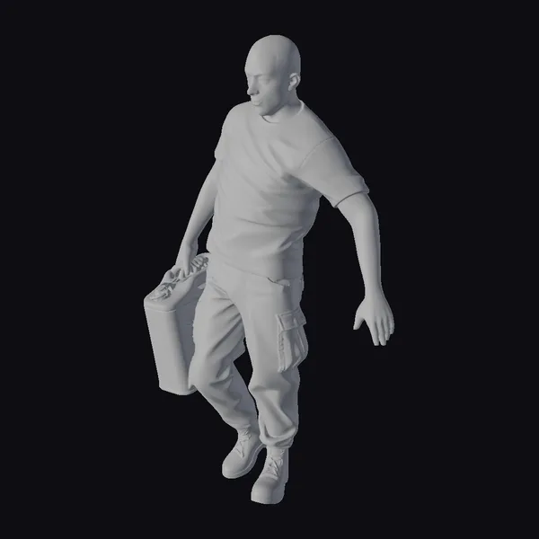 Rendered in meticulous detail, the soldier’s pose captures a moment of focused movement, with his weight shifted onto one leg and the jerrican grasped firmly in one hand. The textures of his uniform and equipment are richly detailed, from the creases in his shirt to the buckles on his boots. The lighting accentuates the contours of his face and the gear he’s carrying, highlighting the realism of the model. This 3D model would be perfect for projects requiring a realistic military presence, such as video games, simulations, or historical documentaries.