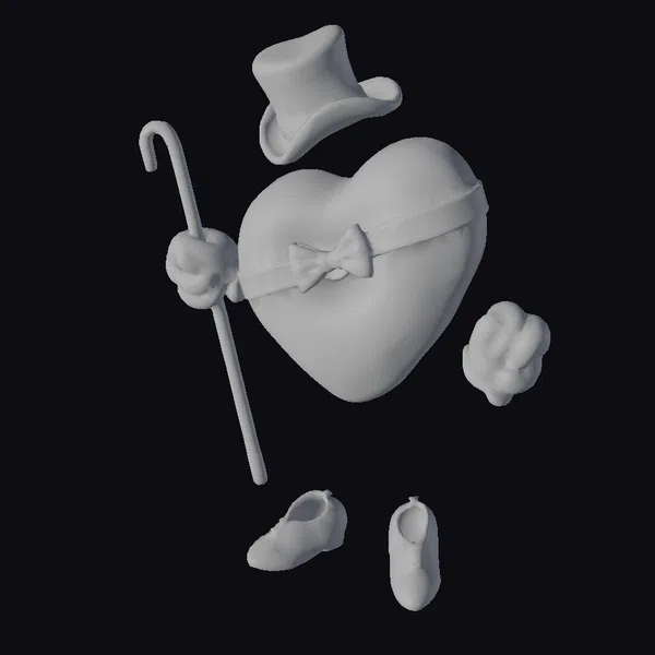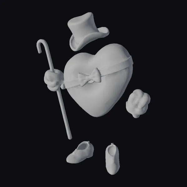 In a whimsical blend of elegance and playfulness, this 3D model presents a heart as the main character, dressed in gentleman’s attire. The heart, a vibrant red, is accentuated with a brown bowtie and belt, giving it a dashing look. Accompanying the heart are a top hat, a cane held by a red glove, another red glove floating freely, and a pair of brown shoes, all meticulously detailed. The stylized design makes this model perfect for projects requiring a touch of whimsy and charm, such as animations, games, or Valentine’s Day-themed content. Its unique blend of humor and style ensures it stands out in any 3D environment.