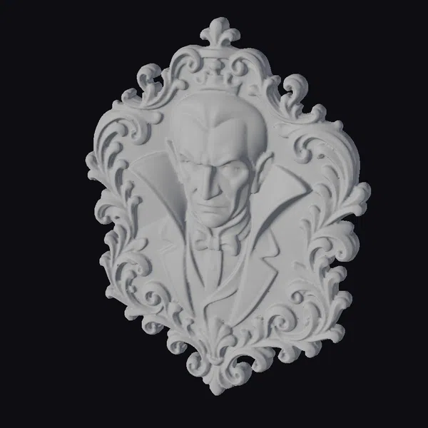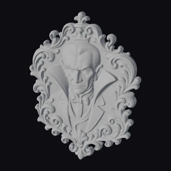 This meticulously crafted 3D model presents a vampire’s portrait in a stunning copper-colored plaque, surrounded by an intricately designed frame. The vampire’s face is rendered with precision, showcasing a stern and enigmatic expression. His hair is slicked back, revealing pointed ears and a sharp, angular face. He wears a high-collared coat and a bow tie, adding to his air of sophistication and menace. The frame itself is a work of art, with swirling patterns that evoke a sense of Baroque opulence. A crown at the top of the frame adds a touch of dark royalty to the overall piece. This model is perfect for use in games, 3D printing, VR/AR experiences, animation, and design projects where a touch of gothic elegance and mystery is desired.