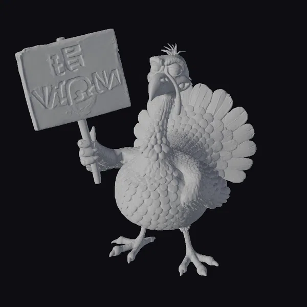 This detailed cartoon turkey 3D model is posed dynamically, holding a cardboard sign with a powerful ‘BE VEGAN’ message. The model’s textures showcase a variety of brown hues, complemented by a yellow beak and legs. The wattle, a classic turkey feature, is rendered in a soft pink. The character’s facial expression is notable for its slight scowl, conveying a sense of seriousness about its cause. The sign, made of cardboard with a simple green leaf illustration, adds a touch of realism to the otherwise stylized character. This model would be perfect for projects focused on veganism, animal rights, or for use in educational materials. Its cartoonish style makes it suitable for a wide range of applications, from animation and games to print and VR/AR experiences.
