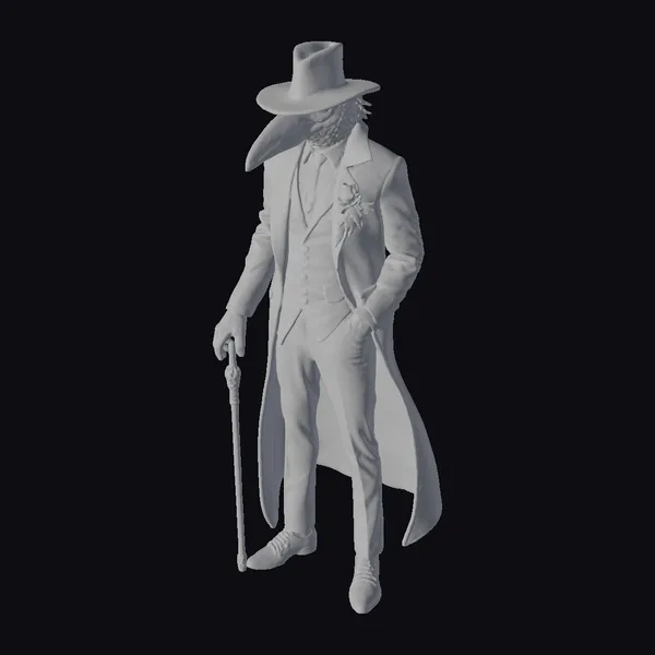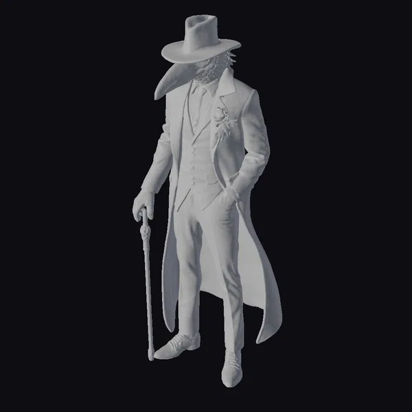 Standing tall with one hand in his pocket and the other grasping a sturdy cane, the Velvet Crow Gangster commands attention. His crow mask, a striking feature, is complemented by a wide-brimmed hat and a long, flowing coat. The jacket’s lining is intricately woven with feathers, adding a touch of elegance to his overall dark and brooding appearance. The gangster’s outfit is a masterclass in texture and detail, from the shiny leather to the subtle sheen of his black suit. This model is perfect for games, animation, or design projects that require a sophisticated yet ominous character.