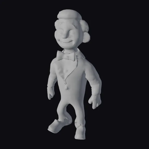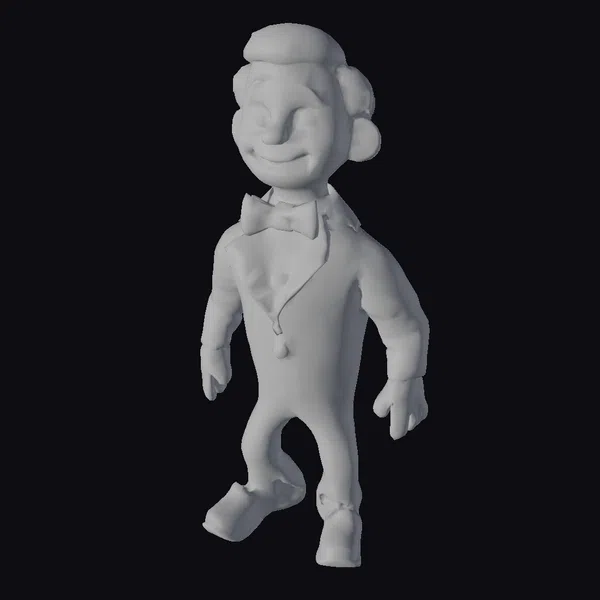 Detailed with precision, this 3D model of a ventriloquist dummy stands out with its dynamic pose, showcasing a charming character with a yellow complexion, brown hair, and rosy cheeks. The dummy’s gray and white striped suit, complete with a bow tie and wooden buttons, exudes a classic yet playful vibe. Its blue eyes gleam with a lively spirit, while the red smile adds a dash of humor. Textured with care, the model’s surface reflects light, highlighting its wooden gloves and shoes. Ideal for use in games, animations, or 3D printing, this model brings to life scenarios of entertainment, storytelling, or even educational contexts, offering a versatile tool for creators.