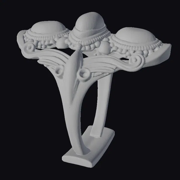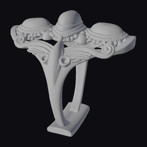 This exquisite ring boasts a gold base with a unique, split-band design, supporting three large, rounded coral stones. The stones are encircled by decorative borders, adding to the ring’s opulent appearance. The blue enamel accents, shaped like curved lines and dots, complement the coral stones beautifully. The intricate details and craftsmanship of this piece make it perfect for use in various applications, including games, 3D printing, VR/AR experiences, animation, and design projects. The ring’s ornate design and vibrant colors are sure to draw attention and add a touch of elegance to any project.