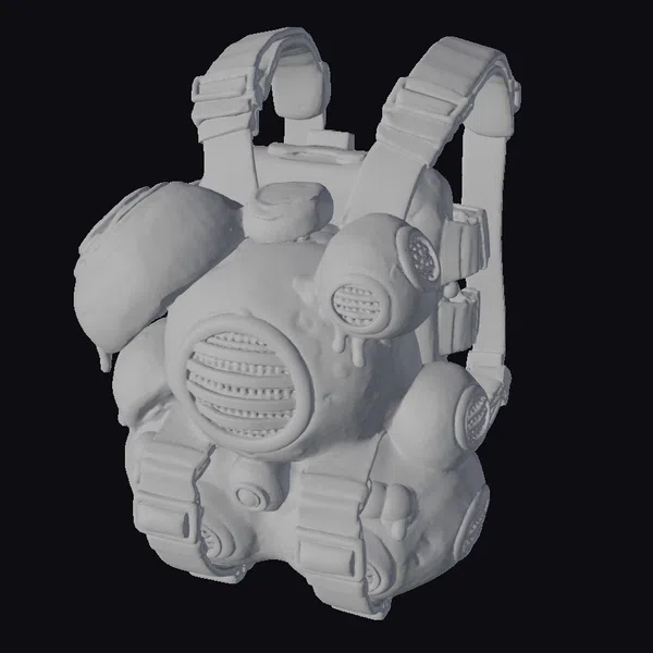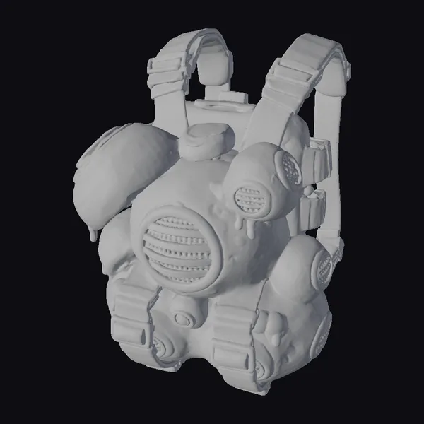 Perched atop a base of neon green, this stylized parasite mushroom pack bursts with colorful energy. Multiple pink and green components are interconnected, giving the impression of organic growth. The pack is adorned with industrial-style vents and buckles, contrasting with the playful rainbow straps. The overall design is a fusion of sci-fi and fantasy elements, perfect for adding a pop of personality to games, animations, or designs. Its unique blend of materials and textures makes it a standout accessory for any character, from Splatoon-inspired heroes to cyberpunk adventurers.