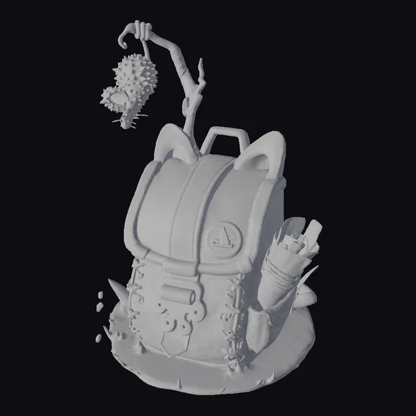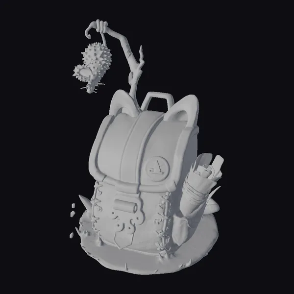 Perched on a bed of vibrant green grass, this cartoon-style backpack is a marvel of whimsical design. The turquoise and orange hues blend seamlessly into a gradient of blues, giving the impression of a well-worn travel companion. A sturdy branch emerges from the top, adorned with a pink rope and a swirling white and blue object that adds to the sense of movement. The backpack’s front features a golden emblem and buckle, while a pouch on the side holds a rolled-up green and white item. The model’s intricate details, from the grassy base to the buckle’s ornate design, make it perfect for games, animation, or 3D printing. Its unique blend of fantasy and adventure elements will transport your audience to new worlds.