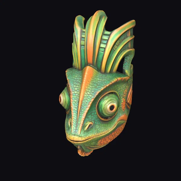 Perched dynamically on an invisible axis, the Vibrant Wooden Chameleon Mask commands attention with its bold, stylized presence. The mask’s surface is a marvel of texture and color, with scales that shimmer in shades of green and orange, gradating smoothly into one another. A large, expressive eye serves as the focal point, framed by delicate, curved fins that add a sense of movement. The mask’s robust palette, ranging from deep lime greens to vibrant sunset oranges, captures the essence of its tropical inspiration. Crafted with meticulous attention to detail, this model is perfect for those looking to infuse their projects with a touch of whimsy and wonder. Whether you’re a game developer, animator, or 3D artist, this mask can add a unique element to your work, transporting viewers to fantastical realms.