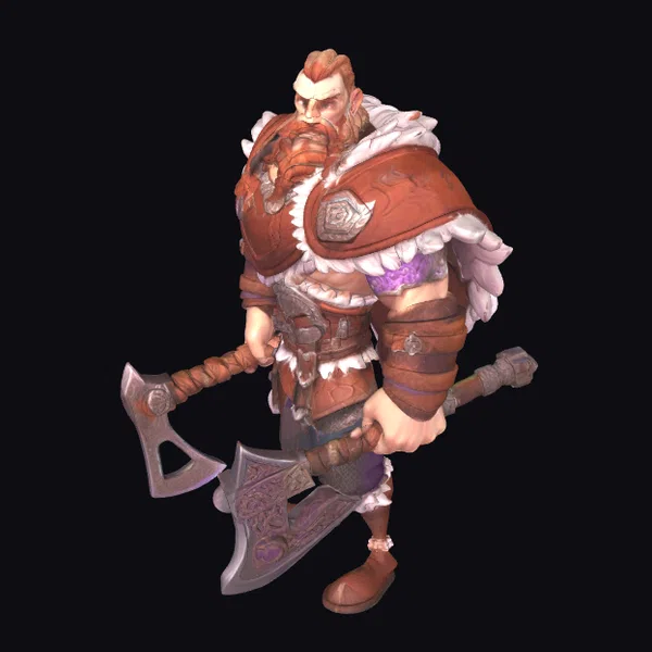 Standing tall with a powerful stance, the Viking warrior showcases intricate details in his stylized design. His armor, a mix of leather and fur, provides a glimpse into the harsh yet majestic world of medieval warriors. The battle-axe, held firmly in his hand, speaks to his readiness for combat. The character’s design makes him a versatile asset for projects requiring a heroic or historical touch, suitable for games, animations, or designs that call for a strong, mythological presence.