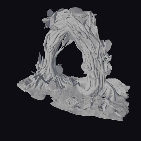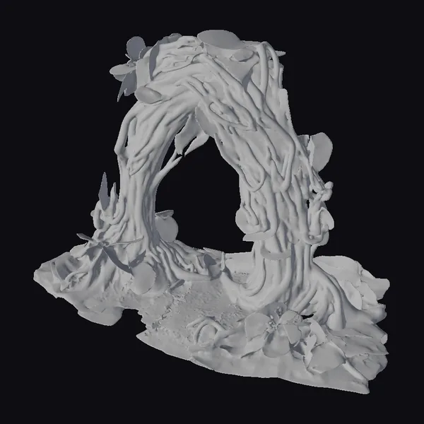 Perched atop a base of rugged, moss-covered earth, the archway’s thick, intertwining roots resemble a living entity. The texture of the roots is rough and weathered, with visible ridges and grooves, while the leaves are a bright, lively green. The archway’s pose suggests dynamic movement, as if it’s about to sprout new life. The lighting accentuates the earthy tones and highlights the lush foliage, creating a sense of depth and dimensionality. This stunning piece can be used in various applications, including games, 3D printing, VR/AR experiences, animation, and design projects, where a touch of fantasy and nature is desired.