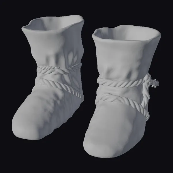 Detailed with precision, these burlap boots are posed with a slight outward tilt, showcasing their rugged construction. The burlap material is intricately textured, with visible weave patterns and a worn, natural look. The rope laces are wrapped around the boots in a crisscross pattern, adding to their rustic appeal. The boots’ earthy tones range from light beige to darker, dirtier patches, giving them a well-worn appearance. The soles are thick and sturdy, with a pronounced tread pattern for added realism. Ideal for use in projects requiring a rustic or historical aesthetic, such as period dramas, outdoor adventures, or fantasy settings. They can be used in 3D modeling, animation, or as a detailed prop in virtual environments.