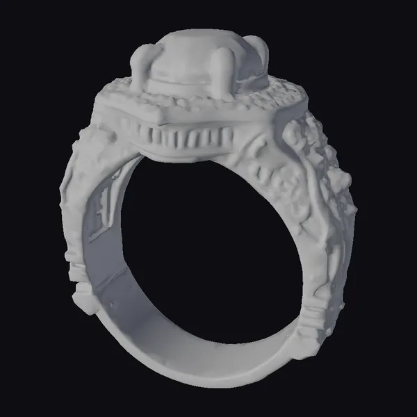 Crafted with meticulous attention to detail, this vintage gold ring boasts a substantial presence on the finger, with a thick, ornately designed band that showcases the artistry of a bygone era. The centerpiece is a large, intricately textured stone, set amidst a halo of smaller stones that add a touch of subtle sparkle. The band itself is adorned with delicate engravings and additional small stones, enhancing its luxurious appeal. This model is perfect for use in high-end jewelry design, historical or fantasy settings in games, films, or virtual reality experiences, and for those who appreciate the finer details in 3D modeling.