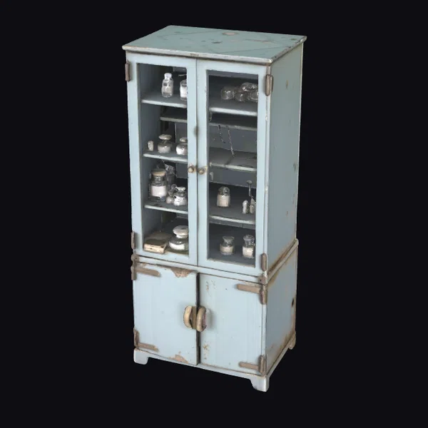 Standing with its doors slightly ajar, this meticulously detailed vintage medical storage cabinet appears to have been plucked straight from the corridors of an abandoned hospital. The light blue, distressed paint and rusted metal hardware lend an air of authenticity to its worn appearance. Inside, shelves are stocked with an assortment of medical supplies, including vials, jars, and other equipment, offering a glimpse into a bygone era of medical practice. The cabinet’s proportions and textures are accurately captured, from the slight chipping of the paint to the intricate details of the hardware. This model is perfect for use in games, 3D printing, VR/AR experiences, animation, and design projects where a touch of nostalgia and realism is required.