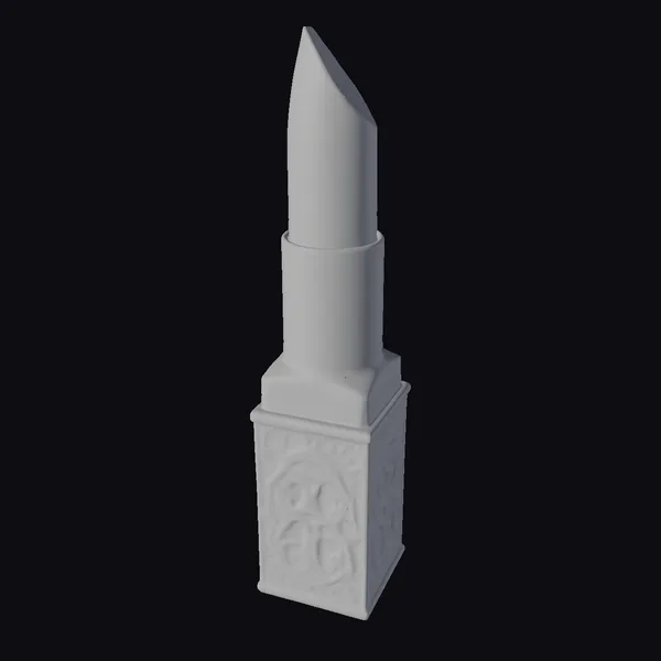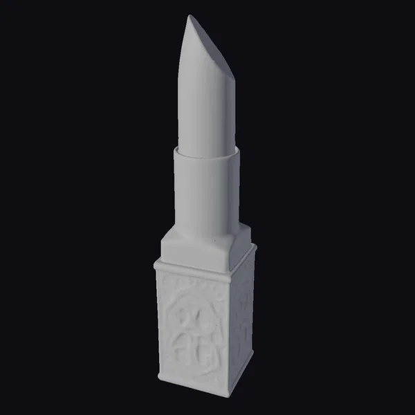 Standing tall with its pointed tip, this vibrant red lipstick is encased in a meticulously designed gilded metal holder. The case features elaborate floral patterns that are intricately embossed, reflecting light and adding to the overall opulence of the piece. The contrast between the cool, metallic case and the warm, inviting color of the lipstick creates a visually appealing combination. This model is perfect for use in games, 3D animations, virtual reality experiences, or as a detailed design element in various projects. Its high level of detail, from the texture of the lipstick to the delicate engravings on the case, ensures it can be used in both close-up and wider scenes.