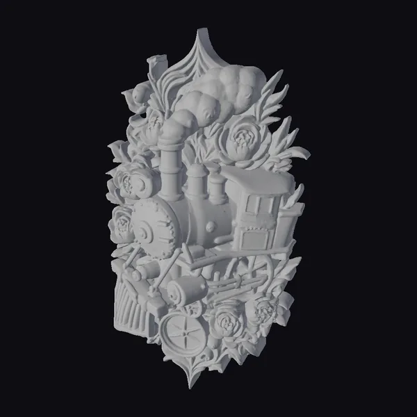 This meticulously crafted decorative piece showcases a steam train enveloped in a vibrant floral arrangement, predominantly featuring golden roses and green leaves. The train itself boasts a rich, green body accented with gold, complete with detailed wheels, a chimney emitting puffs of white smoke, and a small carriage. The ensemble is framed by an ornate, golden border, enhancing its vintage charm. The intricate textures, from the smooth train body to the delicate petals of the roses, invite the viewer to appreciate the blend of industrial and natural elements. This model is perfect for use in games, 3D printing, VR/AR experiences, animation, and design projects where a touch of nostalgia and elegance is desired.