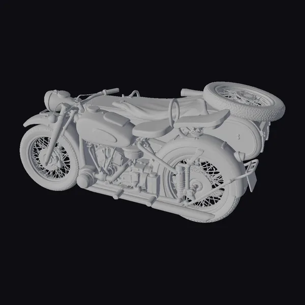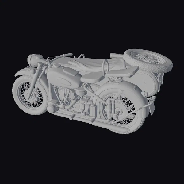 Positioned dynamically, the motorcycle’s sidecar is equipped with a spare tire, emphasizing its readiness for adventure. The silver bodywork is meticulously detailed, with a black leather seat that invites riders to take a spin. The wire-spoke wheels and classic design elements evoke a bygone era of motorcycling. Textures are rich and realistic, with subtle hints of wear that add to the model’s vintage allure. Ideal for use in games, animations, or architectural visualizations, this model brings a touch of nostalgia to any scene.