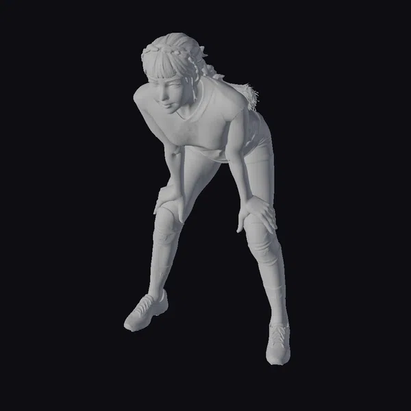 Rendered in exquisite detail, this 3D model of a female volleyball athlete captures the essence of dynamic movement and focused determination. Her blonde hair is styled in a practical yet stylish braid, complemented by a navy blue jersey adorned with a sponsor logo, black shorts, white knee pads, and silver cleats with red accents. The pose, with hands on knees and weight slightly forward, conveys a sense of poised readiness to spring into action. The model’s realistic proportions, detailed textures, and lifelike facial features make it an exceptional choice for projects demanding a high level of realism. Ideal for use in sports simulations, video games, animation projects, or as a detailed character study for designers and artists.