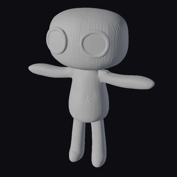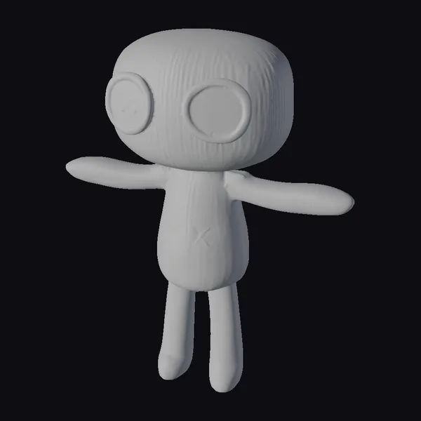Standing with outstretched arms, this stylized voodoo doll model boasts a rounded, wooden body and head, marked with black stitches forming an ‘X’ on its chest and button eyes with black ‘X’ centers. The doll’s pose and facial features evoke a sense of playful mystique. Textured with a wood grain effect, the model’s surface adds to its folk art allure. Ideal for use in games, 3D printing, VR/AR experiences, animation projects, or design visualizations, this model brings a touch of whimsy and magic to any creative endeavor.
