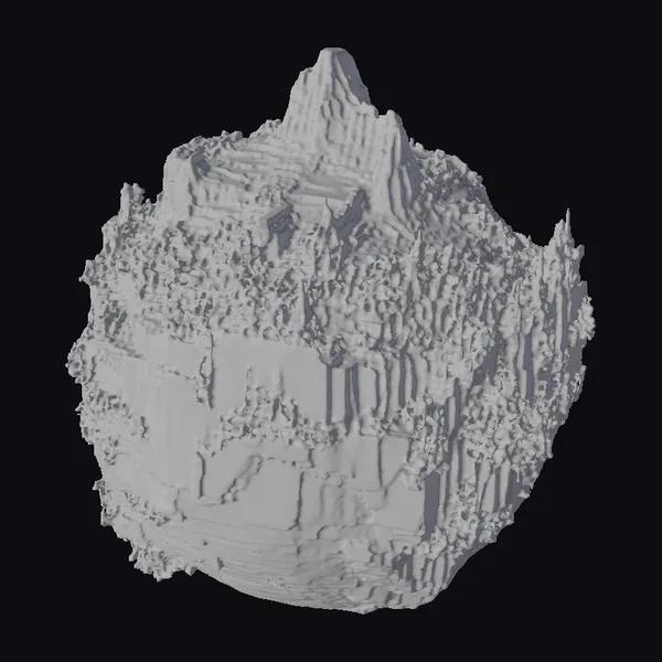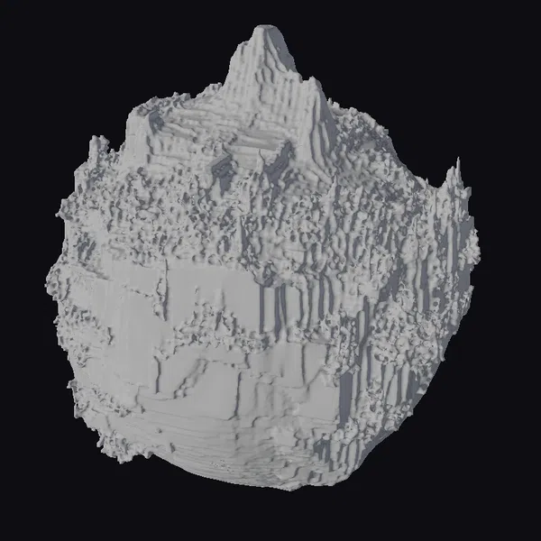 Perched atop a stark white background, this voxelated planet model presents a mesmerizing blend of earthy tones and vibrant greens. The rocky surface is intricately detailed with jagged cliffs, serene lakes, and an abundance of foliage. The model’s stylized appearance lends it a unique charm, making it perfect for projects requiring a fantastical or sci-fi landscape. Its versatility allows it to be used in various applications, including game development, animation, virtual reality experiences, and architectural visualizations. The model’s high level of detail, from the texture of the rocks to the delicate foliage, ensures that it will add depth and realism to any project.