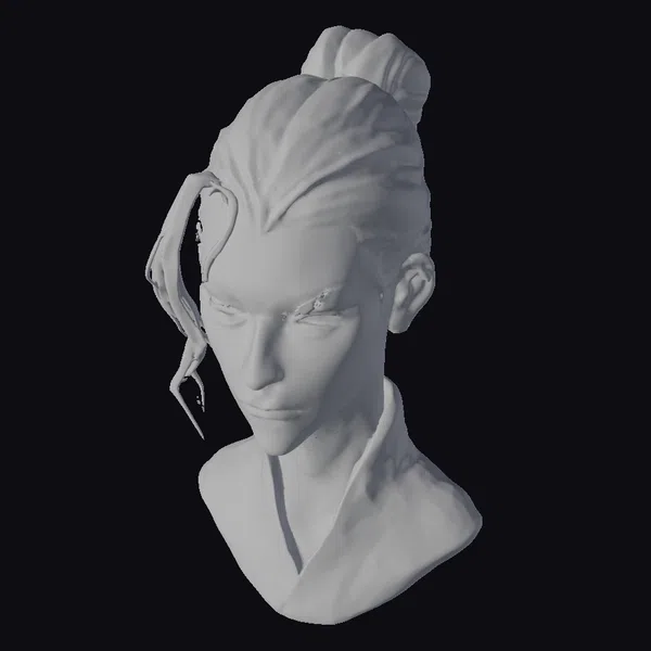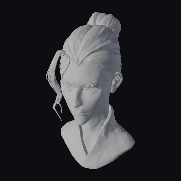 This detailed bust captures a warrior in a moment of contemplation, his white hair styled in a top knot, with a singular strand cascading down like icicles, suggesting a story of battle and resilience. The texture of his hair and the icicle-like strand are finely detailed, catching the light with a subtle sheen. His expression is one of quiet determination, eyes narrowed slightly as if assessing the horizon for challenges. The gray collar of his shirt provides a stark contrast to his white hair, adding to the visual appeal. This model is perfect for projects requiring a character with a strong, enigmatic presence, suitable for games, animation, print, VR/AR, and design applications.