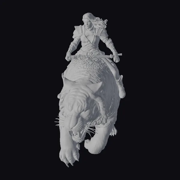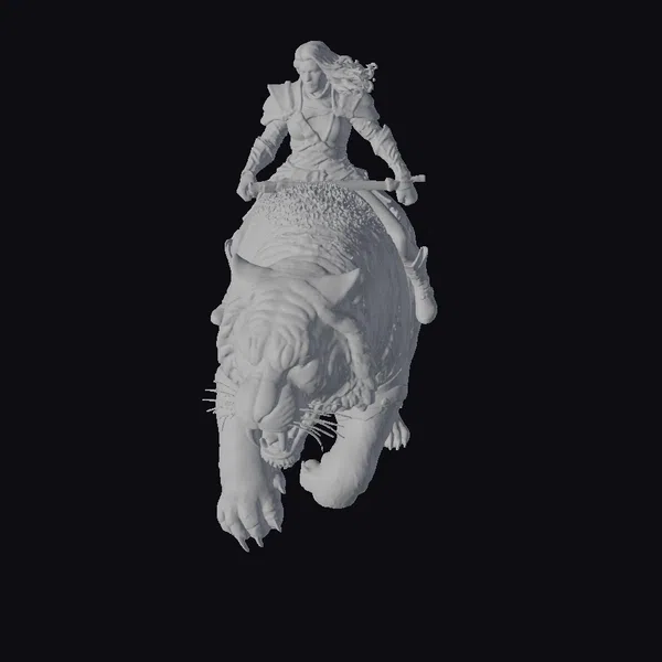 This stunning 3D model depicts a female warrior astride a tiger, capturing a dynamic moment of action and strength. The warrior’s long blonde hair flows behind her as she grips a sword, her gray armor glistening with a metallic sheen. The tiger, rendered in exquisite detail, seems to leap forward with its mouth agape and claws outstretched. The model’s realistic style and intricate textures make it perfect for use in games, animation, or as a design asset. The pose conveys a sense of movement and energy, drawing the viewer into a world of fantasy and adventure.