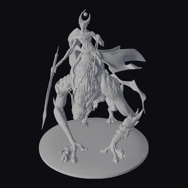This striking 3D model showcases a battle-hardened warrior astride a ferocious white wolf, poised for combat. The warrior’s physique is defined, with pronounced muscles visible under his skin, and he wears a distinctive headpiece that adds to his intimidating presence. His cape flows dynamically behind him, suggesting movement and energy. The wolf, with its sharp claws and teeth bared, appears ready to pounce. The model’s details are meticulously crafted, from the texture of the wolf’s fur to the warrior’s weaponry. Ideal for use in games, 3D printing, VR/AR experiences, animation, and design projects, this model brings a touch of dark fantasy to any project.