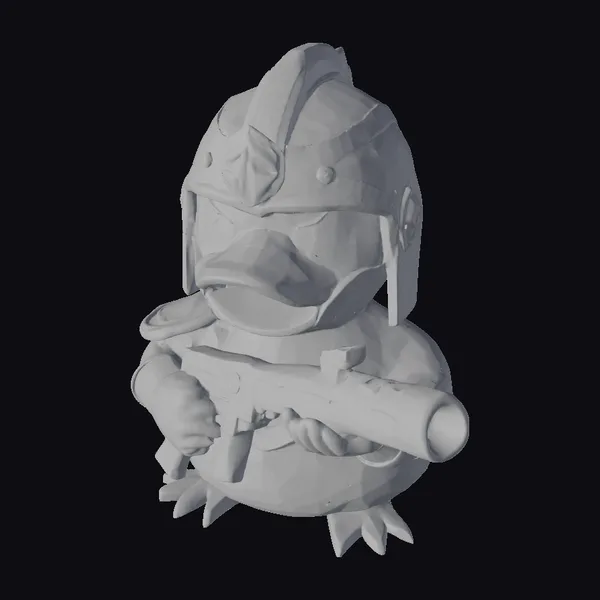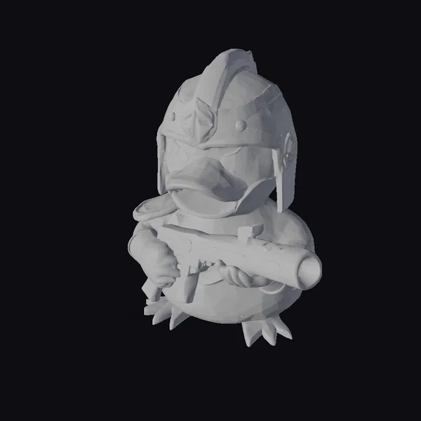 This vibrant rubber duck model is posed in a powerful stance, showcasing its detailed textures and colors. The gray and silver helmet sits atop its head, complete with a distinctive fin on top, while its bright orange beak and feet add a pop of contrast. The duck’s arms are covered in matching yellow and gray armor, gripping a black and orange gun that’s almost as big as it is. The model’s intricate details, from the duck’s expressive eyes to the gun’s textured surface, make it perfect for use in games, 3D printing, VR/AR experiences, animation, and design projects. Its unique blend of humor and heroism makes it a standout addition to any creative project.
