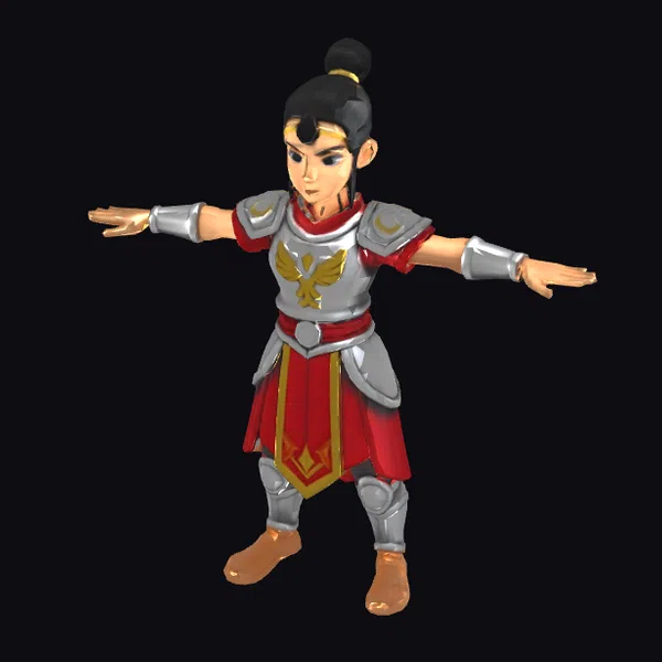 Detailed with precision, this cartoon warrior model showcases a unique blend of fantasy and playfulness. The character stands with arms outstretched, wearing a distinctive red and silver armor set highlighted with golden details, including a golden emblem on the chest. The armor consists of a breastplate, shoulder guards, arm cuffs, a belt, a short skirt, greaves, and boots. The black hair is styled in a top knot, adding to the character’s heroic stance. The model is highly detailed with a focus on vibrant textures and dynamic lighting, making it suitable for various applications such as game development, animation projects, virtual reality experiences, and architectural visualizations. Its high-quality design ensures seamless integration into any fantasy or adventure-themed project.