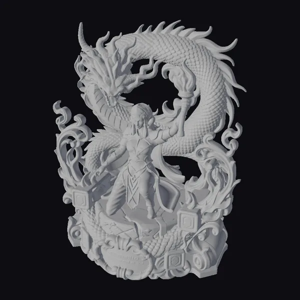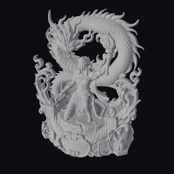 In a dynamic pose that commands attention, the warrior and dragon duo emerge from a base adorned with mysterious runes and flames, set against a backdrop of swirling fire. The warrior, clad in detailed gold and blue armor, holds a torch aloft, symbolizing courage and strength. The dragon, with scales that glimmer in various shades of green, wraps itself around the warrior, embodying protection and unity. This sculpture is rich in texture, from the metallic sheen of the armor to the organic scales of the dragon. The lighting accentuates the raised details, creating a sense of depth and realism. Ideal for enhancing games, animations, or virtual reality experiences with a touch of fantasy and adventure.