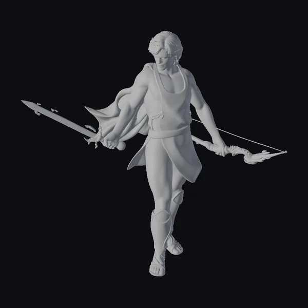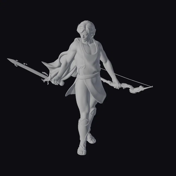 In a powerful stance, the warrior’s body is angled slightly to the left, his gaze fixed intently on some unseen horizon. His short, brown hair is tousled, and his facial features are chiseled, with a strong jawline and piercing eyes. The warrior’s attire is a testament to his status as a legendary fighter: a sleeveless blue top with gold trim, a green skirt-like garment, and a wide gold belt cinched at his waist. A red cape flows dramatically behind him, its folds billowing as if caught in a gentle breeze. His right hand firmly grips the hilt of a long sword, while his left hand holds a bow, its string taut and ready. The bow’s intricate design suggests a high level of craftsmanship, with curved limbs and a decorative arrow rest. The warrior’s legs are clad in a single, gold greave on his left leg, and he wears sandals on his feet. The overall effect is one of dynamic tension, as if the warrior is poised to spring into action at a moment’s notice. This 3D model would be perfect for use in games, animation, or print projects where a heroic character is needed.