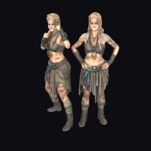 Detailed with precision, this 3D model of a warrior woman showcases her in two striking poses. Her blonde hair cascades down her back as she stands with one hand on her hip and the other with her finger to her lips, exuding confidence and mystery. The tattered remnants of her clothing and the tribal paint on her skin and arms tell a story of battles fought and won. Her physique is strong, with defined muscles under her tanned skin, emphasizing her readiness for combat. The textures of her outfit, from the frayed edges of her skirt to the worn leather of her boots, are meticulously crafted. This model is perfect for projects requiring a strong, ancient warrior presence, such as games, animations, or historical reconstructions.