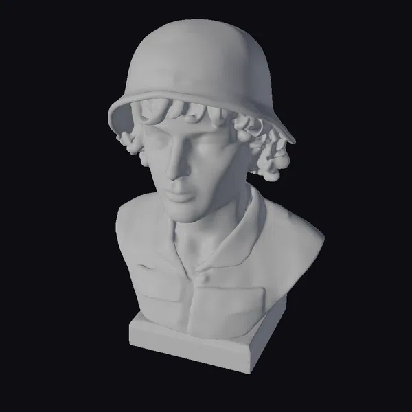 This meticulously crafted bust presents a female warrior in a powerful stance, her curly hair neatly tucked under a military helmet that casts a subtle shadow on her face. The realistic textures of her uniform and the detailed insignia on her chest pocket draw the viewer in, while her piercing gaze seems to look beyond the horizon. The base of the bust features an engraved message, adding an air of authenticity to this remarkable piece. Ideal for use in games, 3D printing, VR/AR experiences, animation, and design projects, this model brings a sense of courage and determination to any project.