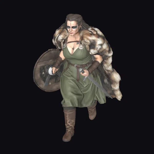 This detailed 3D model depicts a warrior woman in a dynamic pose, her body angled forward as if charging into battle. Her long brown hair flows behind her, complemented by a fur cape with a striking brown and white pattern. She wears a green dress with a deep V-neckline, secured by a brown belt and accompanied by brown leather arm guards and knee-high boots. In her right hand, she holds a large round shield with a metal rim and a central metal boss, while her left hand grips the hilt of a sword. The model’s facial features are defined by dark eye makeup and a determined expression. The level of detail in the textures, from the folds of her dress to the fur cape and the metal shield, makes this model suitable for various applications, including game development, animation, and 3D printing.