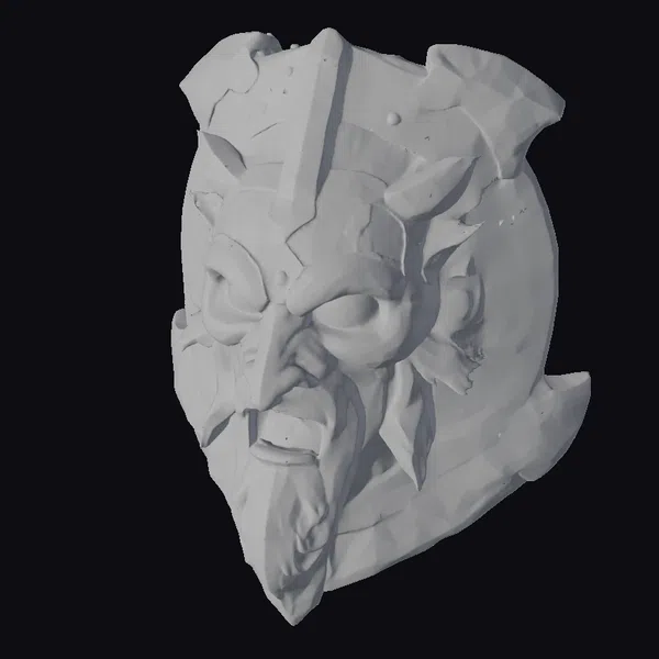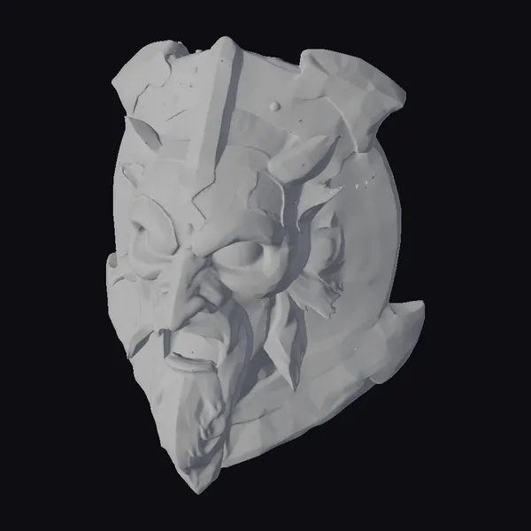 The shield mask boasts a richly textured wooden surface, adorned with a metal band that wraps around its curved edges. Two metal horns protrude from the top, adding to the overall air of intimidation. The warrior’s face is a masterclass in expression, with deep-set eyes and a snarling mouth that seems to be frozen in a battle cry. The metal accents are studded with rivets, lending an air of rugged authenticity to the piece. Whether you’re a game developer, animator, or simply a fan of fantasy, this shield mask is sure to inspire. Its versatility makes it perfect for use in games, animation, 3D printing, or as a design reference.