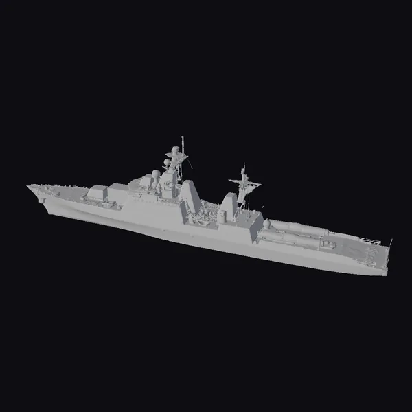 Perched on a stark white background, the warship’s dynamic pose showcases its impressive design. The hull’s bold red stripe contrasts sharply with the pristine white upper deck, while gray metallic turrets and brown decking add a layer of realism. Equipped with multiple turrets and antennae, this model exudes a sense of power and readiness. Its detailed features make it perfect for use in military simulations, animations, or architectural visualizations where a realistic naval presence is required.