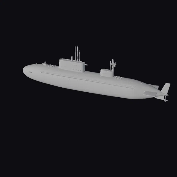 Positioned in a dynamic, slightly angled pose, this detailed submarine model showcases its imposing length and robust structure. The light blue upper section contrasts sharply with the dark grey lower hull, highlighting the vessel’s bi-colored camouflage. Equipped with multiple antennae and a distinctive conning tower, the submarine appears ready for a covert operation. Its smooth, realistic surface is punctuated by subtle detailing, including hatch openings and a sharply angled rudder. This model is perfect for projects requiring a realistic military submarine, suitable for use in simulations, 3D environments, animations, or as a detailed architectural reference.