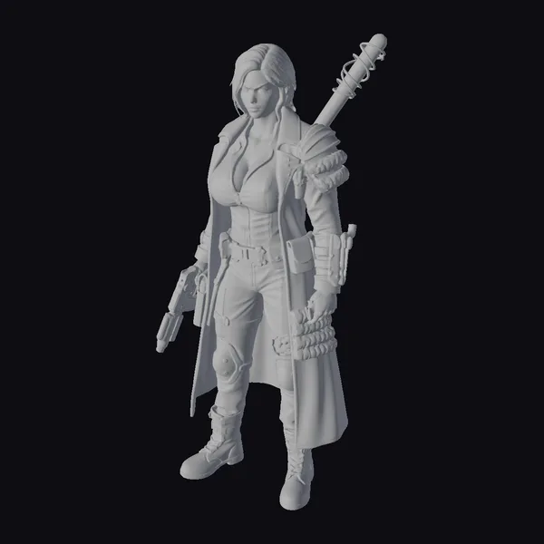 Rendered in meticulous detail, this stylized female warrior exudes a sense of resilience and determination. Her brown hair is styled in a practical, short cut, while her blue jumpsuit, adorned with gold accents, showcases a blend of functionality and style. A long, brown leather jacket with metallic accents drapes over her shoulders, complemented by knee-high black boots. A guitar slung over her shoulder and a gun in her hand underscore her readiness for battle. The model’s pose, with one knee slightly bent, conveys a sense of dynamic tension. Textures are rich and detailed, with visible wear and tear on her outfit, suggesting a character well-versed in the harsh conditions of a post-apocalyptic world. This model is perfect for projects requiring a strong, capable female protagonist, suitable for games, animation, print, VR/AR experiences, and design applications.