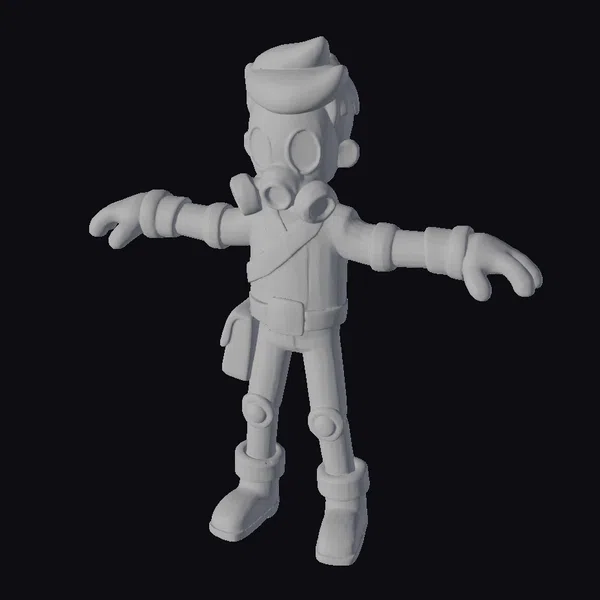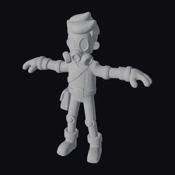 Standing tall with arms outstretched, this post-apocalyptic character model is a testament to the human spirit’s capacity for survival. The gas mask, a crucial piece of protective gear, sits atop a determined face, while the orange and brown attire suggests a blend of functionality and makeshift repairs. The stylized approach to the model’s design gives it a distinctive, almost cartoonish feel, setting it apart from more realistic depictions. Textures are smooth and detailed, with a clear emphasis on conveying a sense of wear and tear. The lighting accentuates the model’s contours, highlighting the joints and seams of the outfit. This model would be perfect for use in games, animations, or even VR/AR experiences, offering a versatile character that can be integrated into a variety of settings.