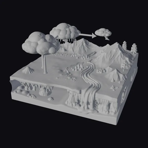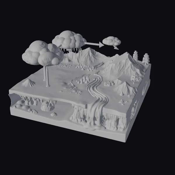 Depicting the intricate dance of water on our planet, this 3D model offers a thorough breakdown of the water cycle. It begins with evaporation from the ocean, forming clouds that move over land, leading to precipitation, and then flowing back into the sea through rivers and streams. The model features varied terrains such as snow-capped mountains, lush forests, and vast bodies of water, highlighting the interconnectedness of our planet’s ecosystems. Ideal for educational purposes, environmental studies, and scientific research, this model provides a visually engaging way to understand complex environmental processes.