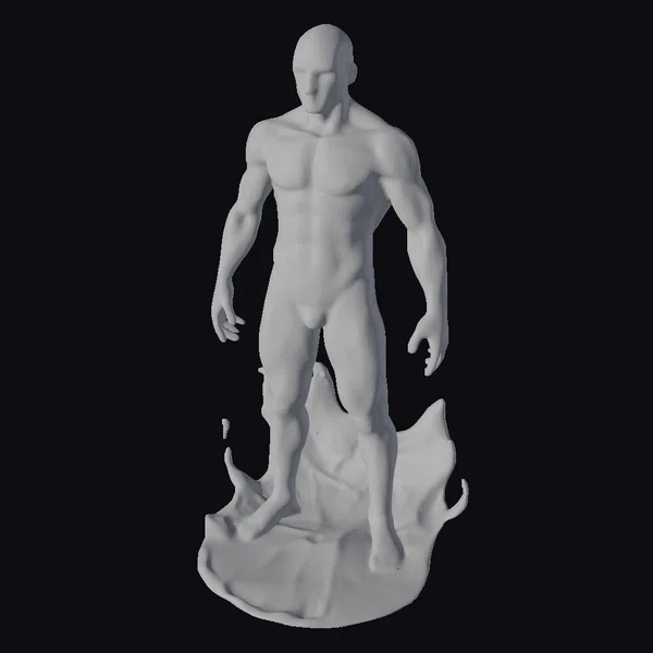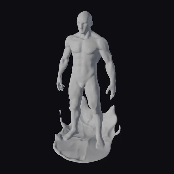 Standing confidently with feet shoulder-width apart, this water elemental male boasts a chiseled physique, with waves of water cascading around his feet. The transparent and shiny texture of his body captures the essence of water in a mesmerizing way. The short hair on his head adds to his strong and defined features. The dynamic pose and lighting highlight the fluidity and movement of water, making this model perfect for animations, games, or 3D printing. Its detailed anatomy and realistic appearance make it suitable for various applications, from visual effects in films to virtual reality experiences.