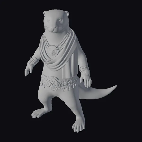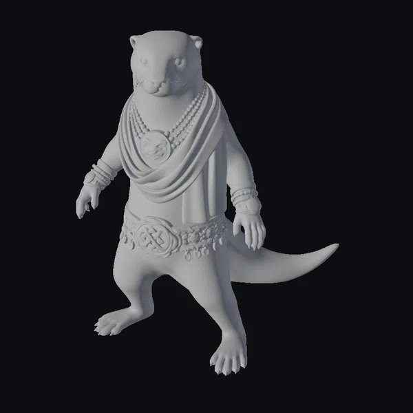 Standing proudly on its hind legs, the wealthy otter showcases its meticulously designed accessories. The teal scarf elegantly drapes over its shoulders, while the copper belt cinches at its waist, adorned with small gems and pearls. Its wrists are stacked with colorful bracelets, adding to its opulent appearance. The otter’s fur is rendered in exquisite detail, with a subtle sheen that catches the light. This model is perfect for use in games, 3D printing, VR/AR experiences, animation, and design projects, offering a touch of whimsy and luxury.