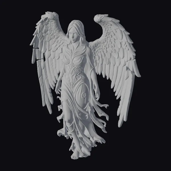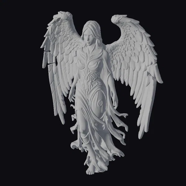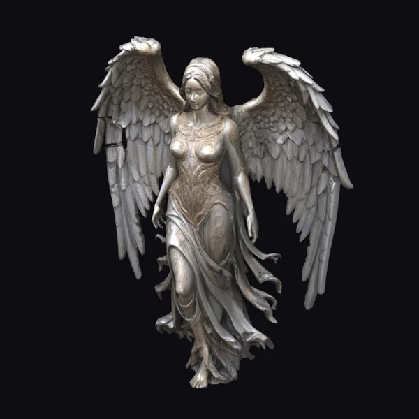 Positioned in a powerful stance, the angelic female figure towers with her expansive wings, a symbol of both strength and grace. Her facial features are finely detailed, with a subtle, downward gaze that invites contemplation. The dress, flowing and ornate, appears to be crafted from the very stone itself, blending seamlessly with the rest of her form. The texture of the stone, weathered to a soft gray, suggests age and resilience. This model is perfect for use in dark fantasy settings, gothic architecture, or as a striking piece in 3D animation and game design. Its high level of detail makes it suitable for close-up shots in VR/AR experiences or as a centerpiece in 3D printed sculptures.
